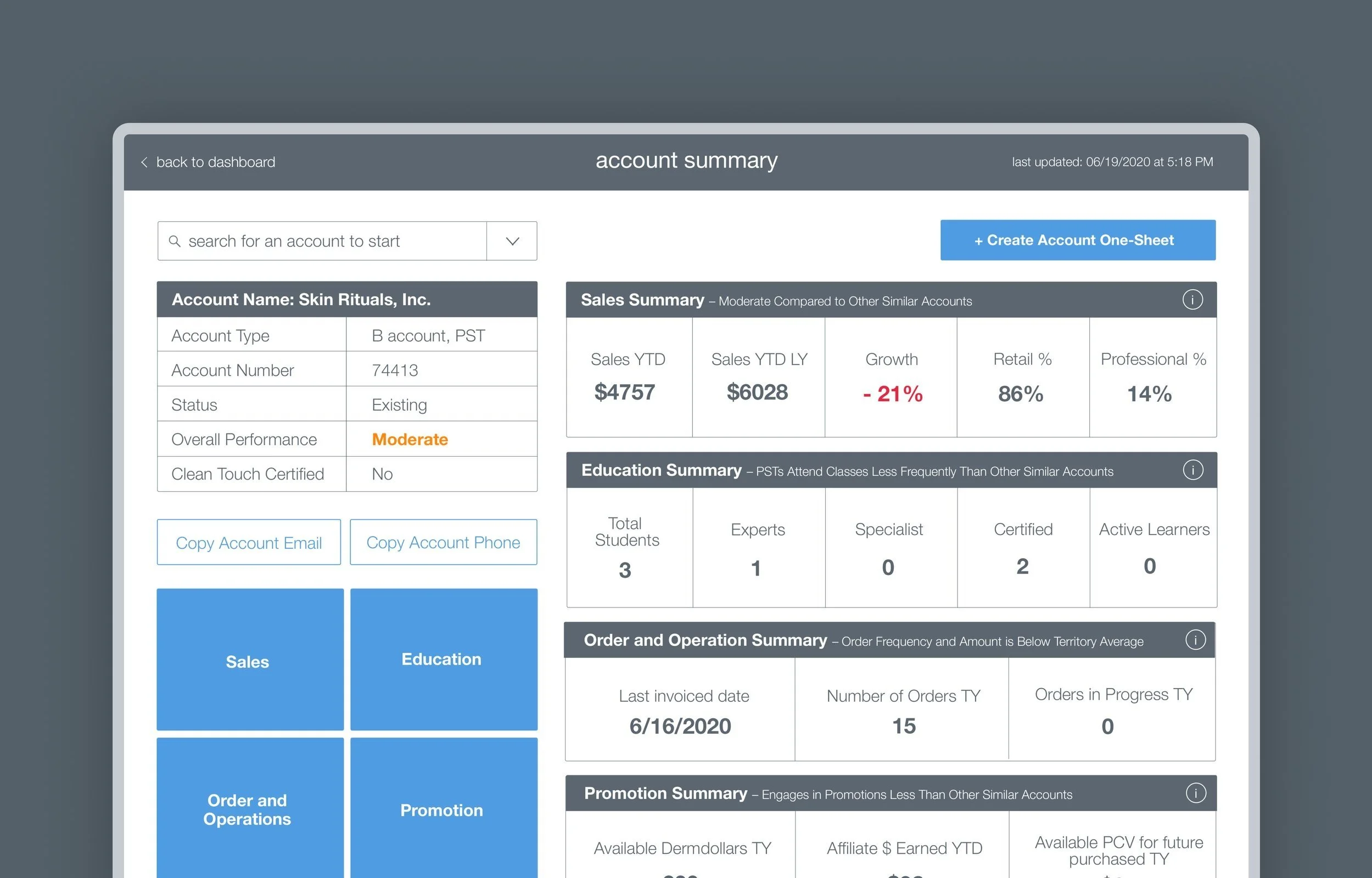 How might we empower Dermalogica's salesforce with real-time account data so that they can better manage and track account progress?