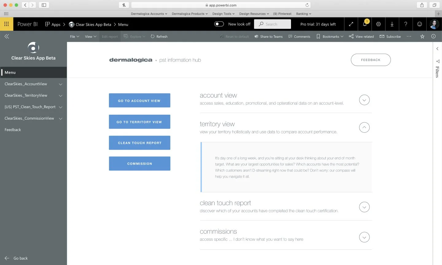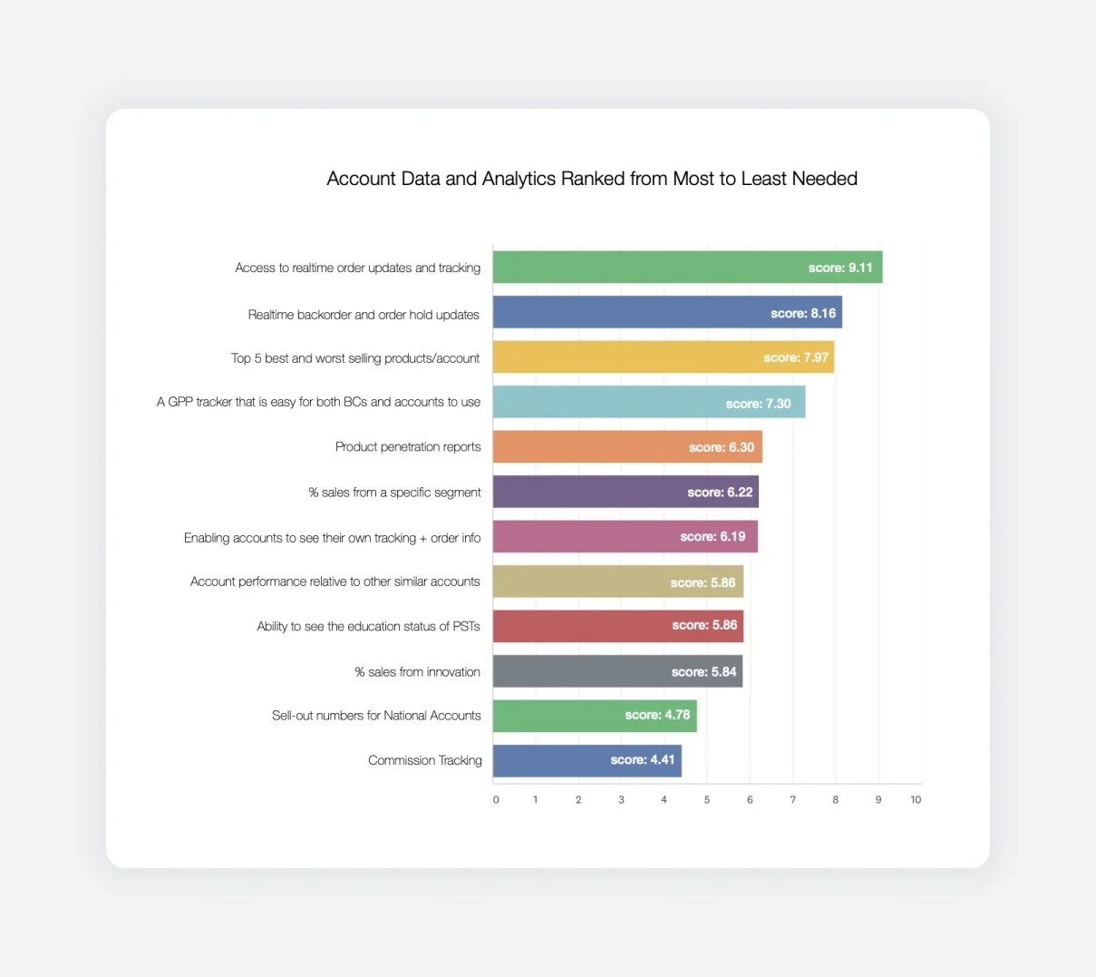 We want to empower business consultants to access sales, product, commissions, and forecasting analytics that can be broken down by both an account and territory level, all from one location/platform on their iPads. The portal should use simple visualizations and UI to make locating and sharing information easy. A notable portion of Business Consultants also wanted detailed reports that they could extrapolate.